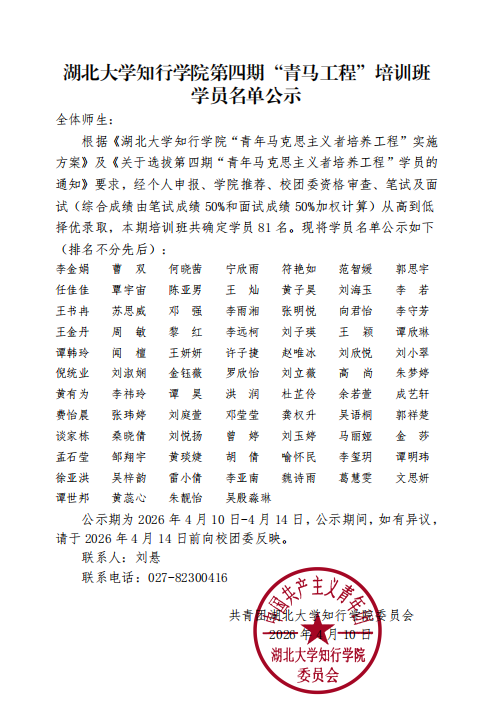 - 关于湖北大学知行学院第四期“青马工程”培训班学员名单公示