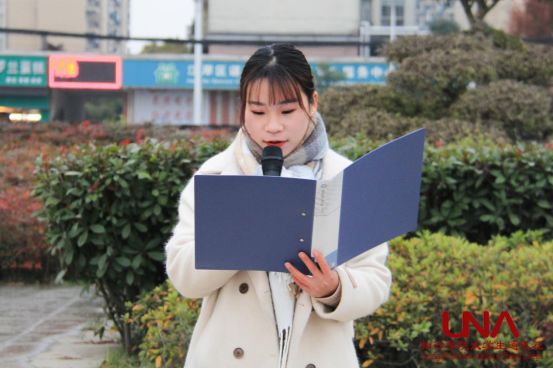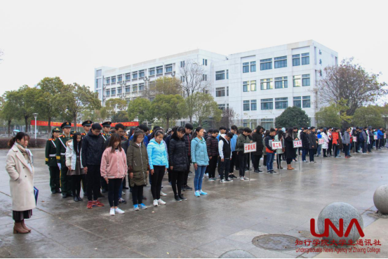 活动第二部分,院学生会主席向晗英结合学习十九大精神,发表国旗下讲话——《不忘国耻·圆梦中华》。她提到,南京大屠杀遇难同胞纪念馆的开放,其目的就是告诉人们,永远不能忘记民族的苦难,不能忘记我们今天的和平是先辈们的鲜血所换来的。前事不忘,后事之师。我们要用实际行动,好好学习,为我们中华民族的伟大复兴贡献出我们应有的力量,让我们的祖国一天比一天强大。80年前的今天,是一个注定要印刻在每个中国人记忆中的日子,侵华日军攻陷南京。短短6周内,30多万中国军民惨遭杀戮,山河破碎,家破人亡。2014年,国家将每年的12月13日设立为南京大屠杀死难者公祭日。历史虽已远去,但绝不能忘。前事不忘,后事之师。我们走出了硝烟的战场,迈入了歌舞升平的和平时代。在我们放声高歌的同时,也应该在心中长鸣警钟。