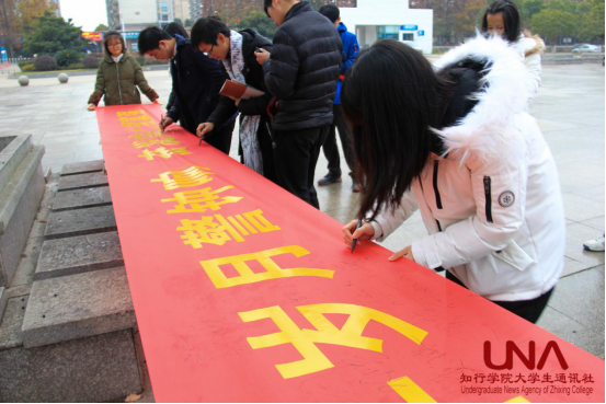 活动第三项,院国旗班组织所有参与人员在“和平岁月警钟响,奋发向上国富强”的横幅上庄重地签上自己的名字,寄托哀思,祈祷和平,以此来郑重承诺铭记历史,开创未来。今天,我们以青春的名义祭奠,铭记历史,我辈当继往开来,永志不忘!勿忘国耻,珍爱和平;奋发图强,壮我中华。