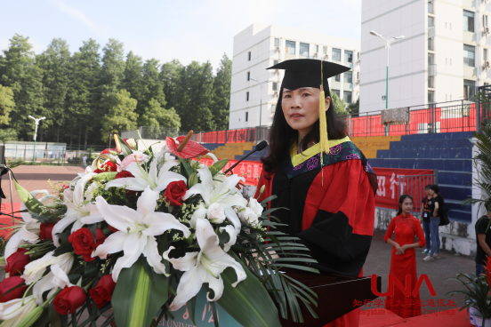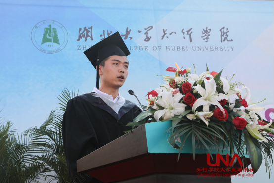 外国语系辅导员向蕊作为教职工代表发言。她回顾四年来与同学们一起学习的点点滴滴,为同学们在校期间取得的成绩而骄傲,为同学们今天的成长而骄傲。她希望同学们今后走入社会,能够快速完成内心角色的转换,从小事做起,不怕吃苦,虚心向他人学习,从知行出发,到达更远的地方,取得更大的成就。“分别之时,我们有诸多不舍,但眼神却更加坚定的望向远方,我们将永远铭记知行的教诲,厚德载物,认知践行。” 优秀学生代表经济与管理系王旭东这样与母校道别。他追忆过去四年在知行的难忘瞬间,分享在知行努力拼搏的收获,他以优异成绩通过飞行员考试,并获得公费去美国学习飞行的宝贵机会的经历,鼓舞着在校生脚踏实地努力奋斗。