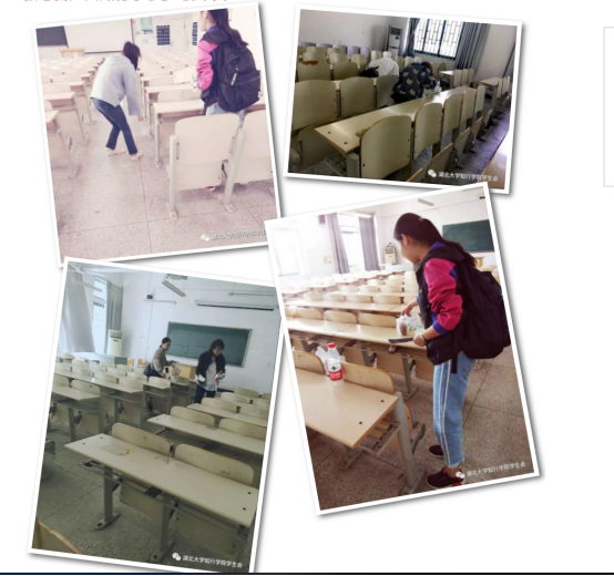 学生干部们以身作则,对每一个教室的黑板进行擦拭,拾起学生课后遗落在课桌里、角落里的垃圾纸屑,在院学生会主席向晗英的带领下,十位学生干部耗时一个小时,牺牲午饭时间,终于营造了干净舒适的课堂环境。