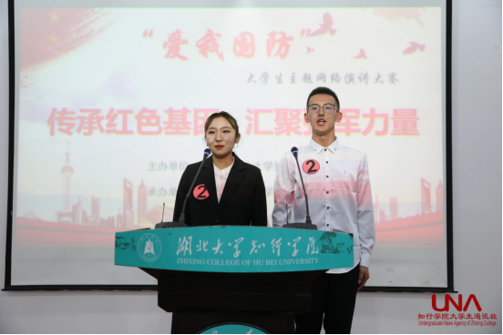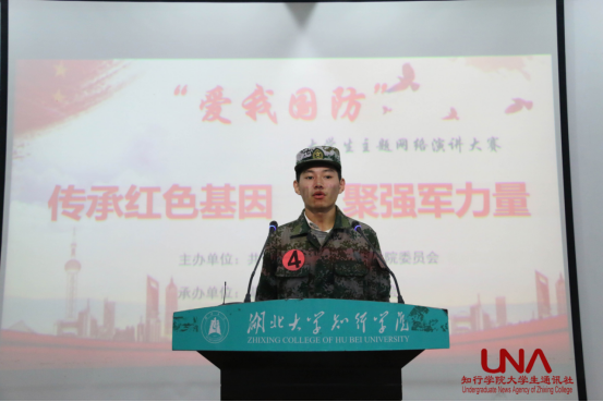 “新时代,迈入国防新时代”是来自外国语系的高倩雯带来的演讲。她在演讲中讲述中国古代国防史。高倩雯表示,以前的中国因为国防力量的不足遭受到外国列强的侵略,现在的中国已不在是一头沉睡的雄狮,中国已经屹立于世界的民族之林。但是我们不能安于现状,世界上仍然存在很多能对中国安全造成威胁的因素。所以,加强国防刻不容缓。高倩雯充满激情的演讲获得现场观众热烈的掌声和评委的好评。来自艺术系的马欣宇、雷严思遥以“犯我中华者,虽远必诛”为题给在场观众献上了一场精彩的表演,“新时代、新征程、新作为,我们要在习近平总书记的指挥下投身新中国特色社会主义中去,作为大学生,我们应该为国防献出自己的一份力。”同时,他们还将自己剪辑的视频及配乐融入自己的演讲中。