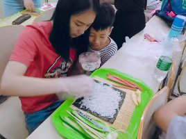每个星期与星孩们的活动都与画画有关,在不同材料上画,如在旗子上画,在卡纸上画,在帽子上画。而这一次选在布袋上面画,很多物品上都是小星星们的杰作,这都是美妙的回忆。在这个快乐的日子里,除了与小星星们画画外,志愿者和星孩们一起做寿司,星孩们都很配合,把做好的寿司给志愿者们分享,并且把打包好的寿司带回家给爸爸妈妈。制作的过程是充满趣味性。
