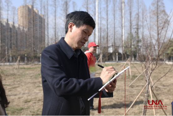 听完副院长黄智凌简单的介绍,师生们齐心协力地用铁铲挖坑,相互配合,把树苗稳稳的放进土坑、扶正,将坑用松土填满、夯实,最后共同浇水,大家都体会到了种植树苗的不易和亲自栽种的快乐。树苗种植完成后,学院领导与师生代表在寄语牌上书写上寄语,签下名字。学院党委书记彭德忠写下寄语:人人植树,造福后代。院长卜诗桢寄语:希望树苗与学生们一起茁壮成长。植苗完成后,师生们与自己亲手种下的树共同合影留念。