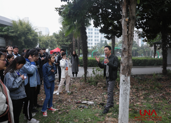 副处长刘志冲在活动中对学生们详细讲解学校植被的分布情况以及各植物的生长习性。他带领学生代表参观整修的校园正门、勤仁坡、知音楼、梅花园等地区,普及有关校园植被的知识,增长了同学们关于校园林植被的见识。刘志冲说:“如果学院每个人都出一份力,只要负责0.01平方米的草地,就能够使校园的绿植更加茁壮成长,为学校的园林建设出一份属于自己的绵薄之力。”