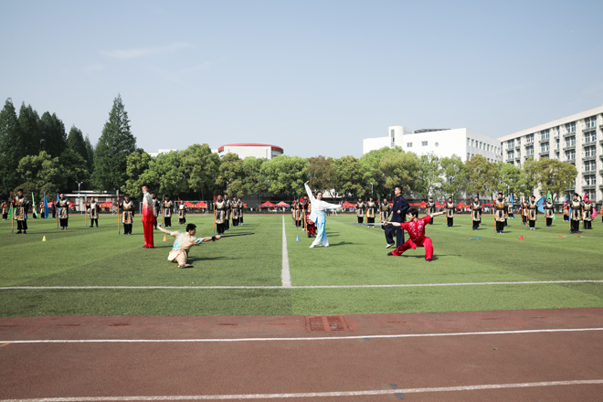 开幕式表演环节中,艺术团团体操表演,百余名知行学子身着统一服装,活力四射,动感的旋律、整齐的动作、展现青春的风貌,手握彩旗、迎风飘扬,彩旗表演气势磅礴。英姿潇洒、身手敏捷,矫如龙祥、强强对抗,舞剑表演让现场观众为之惊叹,获得在场师生阵阵掌声。舞狮队的学子们在欢快的音乐中将雄狮的各种表情和动作演绎得活灵活现。