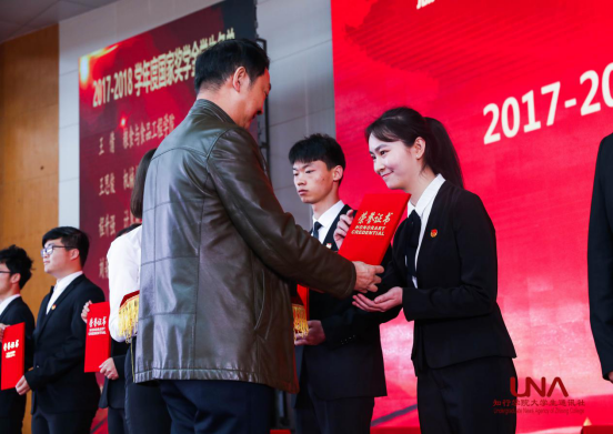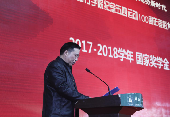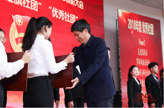 全体起立奏唱国歌后,表彰大会正式开始。副校长黄智凌宣读五四表彰决定,党委副书记高志宏为获得“优秀团干部”、“优秀团员”、“优秀学生干部”的代表及获评“优秀团支部”的代表颁奖,党委委员、纪检组长、正处级纪检员焦新曦为获得“红旗社团”、“优秀社团”的单位颁奖;副校长王文凯宣读“关于表彰荣获2017—2018学年国家奖学金学生的决定”及“关于志愿服务项目评比表彰的决定”,校长卜诗桢为获得国家奖学金的学生及获得“优秀志愿服务项目”、“红旗志愿服务项目”的代表颁奖,在场的师生代表以热烈掌声向受表彰的集体和个人表示祝贺。随后,优秀团员代表欧阳欣荣发言,她通过自己的青春奋斗经历,激励广大青年为实现中华民族伟大复兴的中国梦砥砺前行、不懈奋斗,也希望同学们能坚定理想信念、锤炼高尚品格、勤于学习实践,做敢于有梦,勇于追梦,勤于圆梦的新时代青年。