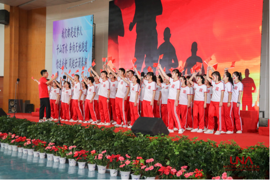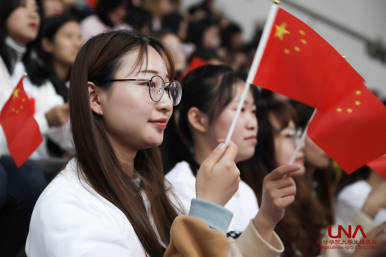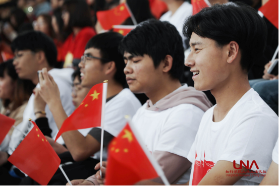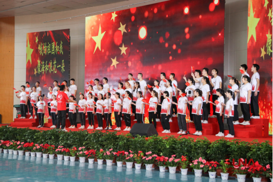 音乐会最后,在主持人的指引下,全场师生起立,挥舞手中的国旗,跟随音乐的旋律,齐唱《我和我的祖国》,音乐会在大家动情的歌声中结束。