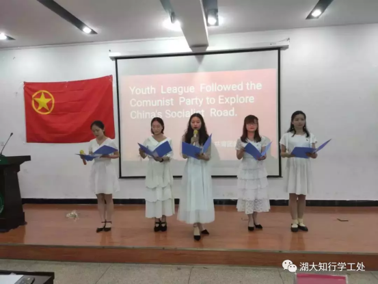 全校各学院组织申报共计十二个“主题团日”活动。在中国共青团之歌的旋律中,5月14日18时30分由我校外国语学院举办的英语口述团史活动在学术报告中心弘文厅正式拉开序幕。外国语学院分团委指导老师向蕊,外国语学院辅导员李婧妮、程星,老师李星以及各院学生代表共计200余人参与本次活动。
