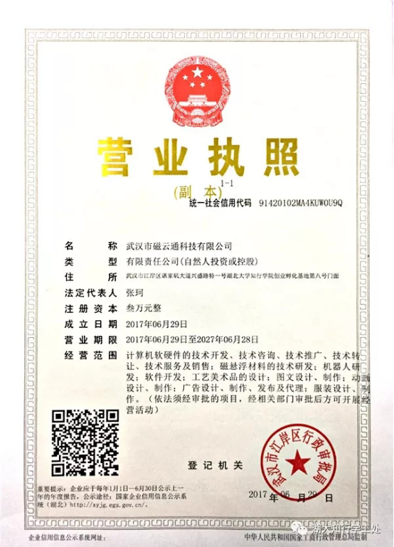 2017年开展《基于工程化物联网系统智慧工厂美洲大蠊产业发展+精准扶贫》项目,带动14名大学生就业并为国家精准扶贫做出明显的贡献。2017年4月入驻学校大学生创业孵化基地,6月,依托创业孵化基地八号店铺成功注册“武汉市磁云通科技有限公司”,为之后创业之路打下深厚基础。2018年1月向国家知识产权局申报专利《四轴消音碟式涵道磁悬浮同轴双旋翼无人机》。同年5月获湖北省大学生创青春创业大赛实践挑战赛铜奖。