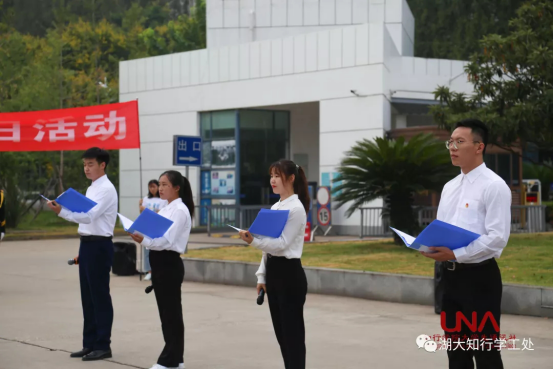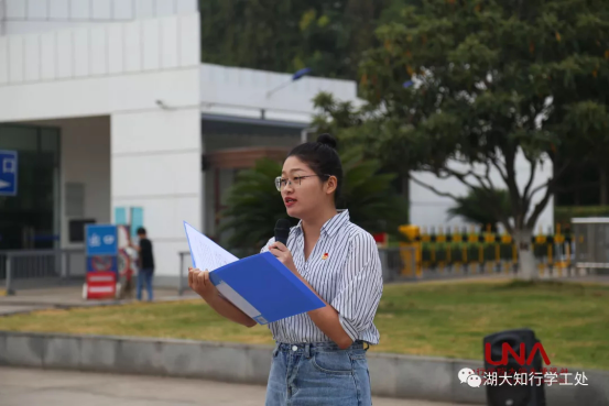 来自广播台的学生代表杨雯进行国旗下的演讲,主题为“信仰浇筑的五星红旗”杨雯分别讲述了五则关于国旗的故事,并通过故事充分展现国旗背后所蕴含的厚重的民族精神。她说:“我们作为大学生,能做的便是学习专业文化知识,永葆初心。”并引用了鲁迅的话。“愿中国青年都摆脱冷气,只是向上走,不必听自暴自弃者流的话。能做事的做事,能发声的发声。有一分热,发一分光。就令萤火一般,也可以在黑暗里发一点光,不必等候炬火。”以此号召青年学子共努力,齐奋进。