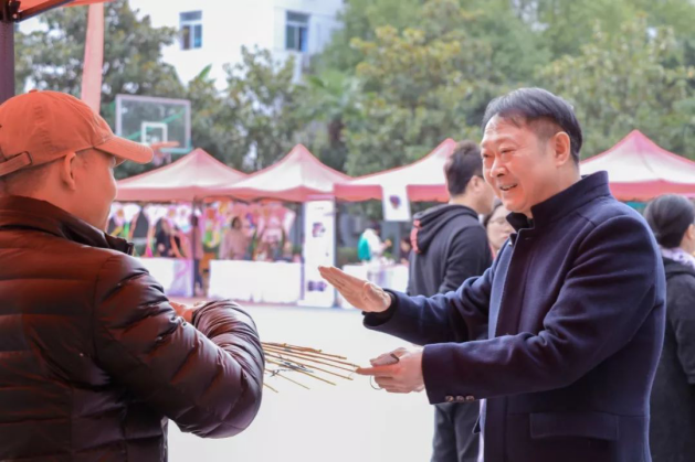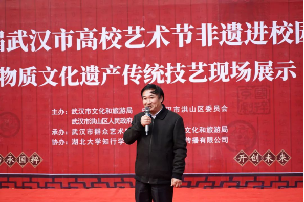 武汉市非物质文化资产中心洪山区分中心主任陈清,湖北大学知行学院党委书记彭德忠、校长卜诗桢、副校长黄智凌、学工处、各学院负责人参与本次活动。