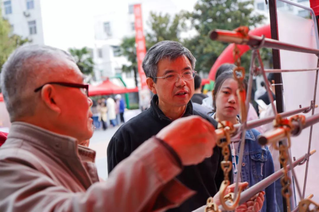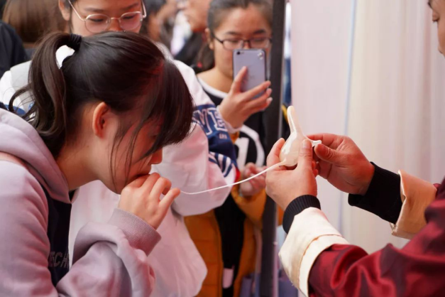 为了让同学们近距离接触非遗,艺术大师们还现场邀请部分同学上台,亲身体验传统文化的独特魅力。各位传承人们更是走到了观众席中间进行全方位展示,进一步拉近了老师们、同学们与非遗文化的距离,现场气氛十热烈。