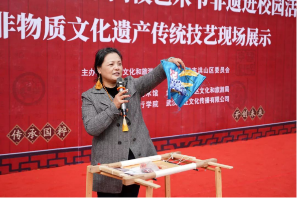 汉绣市级传承人王燕老师详细为我们介绍了将传统的中国工艺和现代时尚结合在一起的汉绣文化,并向我们展示为武汉军运会所绣制品。