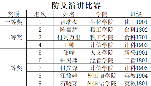 经过一个月的精心准备,九个学院的初赛、复赛,最终推选出共计9位选手进入决赛,他们通过自己的讲述,向大家讲解艾滋病的相关知识,表明自己抗击艾滋的决心,倡议青年大学生参与到抗艾防艾的队伍中来。通过在场评委老师的认真评选,最终比赛结果如图: