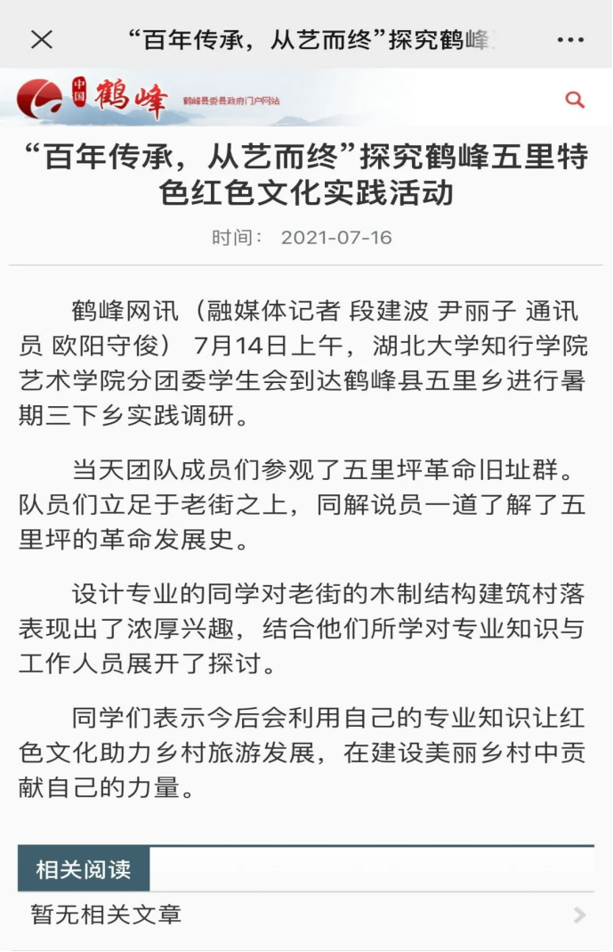 艺术学院“百年传承,从艺而终”乡村振兴实践团队在“三下乡”实践过程中,积极配合相关媒体进行活动宣传,湖北高校思政网、湖北鹤峰县新闻网、武汉校园官方微博对此次“三下乡”实践活动进行了宣传报道。