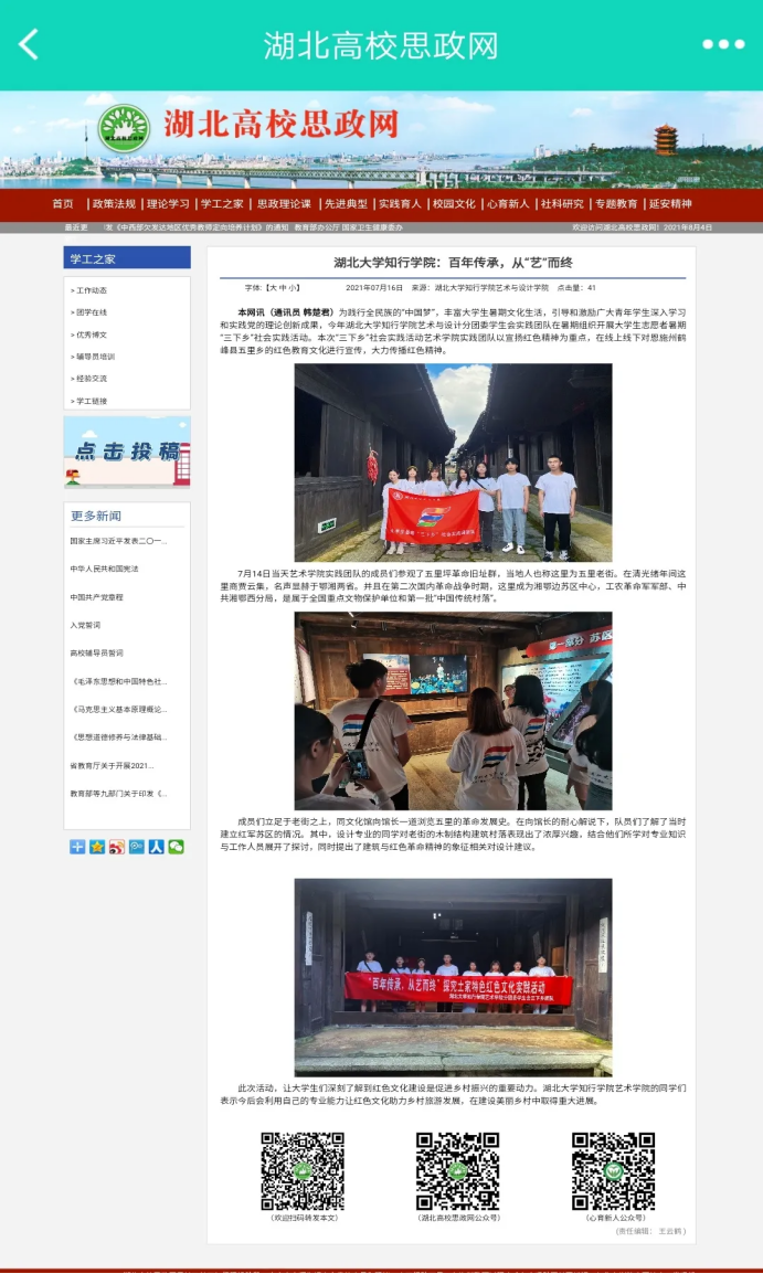 艺术学院“百年传承,从艺而终”乡村振兴实践团队在2021年“走近千村观察,助力乡村振兴”全国大学生暑期社会实践专项活动中成功入选。湖北省仅有6所高校实践团队入选全国重点团队。