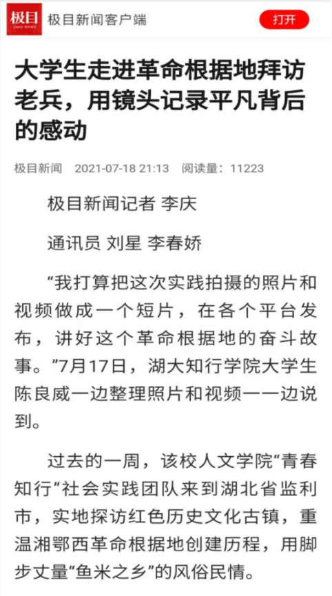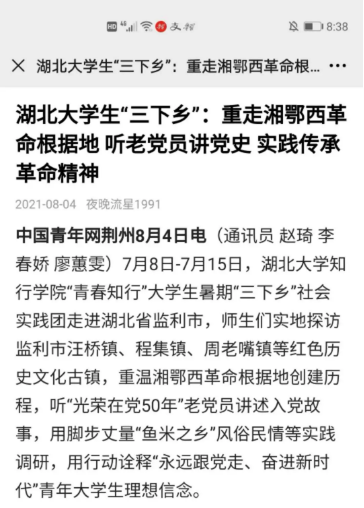湖北大学知行学院人文学院党总支书记、院长任秀霞表示,在建党百年之际,大学生利用暑期开展“三下乡”社会实践,跟老党员面对面学党史,用脚步丈量乡村发展,用专业所学记录乡村振兴变化,十分有意义。