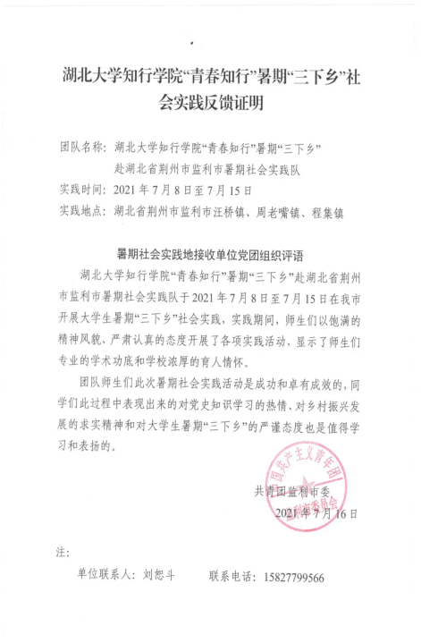 7月8日-7月15日,湖北大学知行学院“青春知行”大学生暑期“三下乡”社会实践团走进监利市,师生们实地探访监利市汪桥镇、程集镇、周老嘴镇等红色历史文化古镇,重温湘鄂西革命根据地创建历程,听“光荣在党50年”老党员讲述入党故事,用脚步丈量“鱼米之乡”风俗民情等实践调研,用行动诠释“永远跟党走、奋进新时代”青年大学生理想信念。