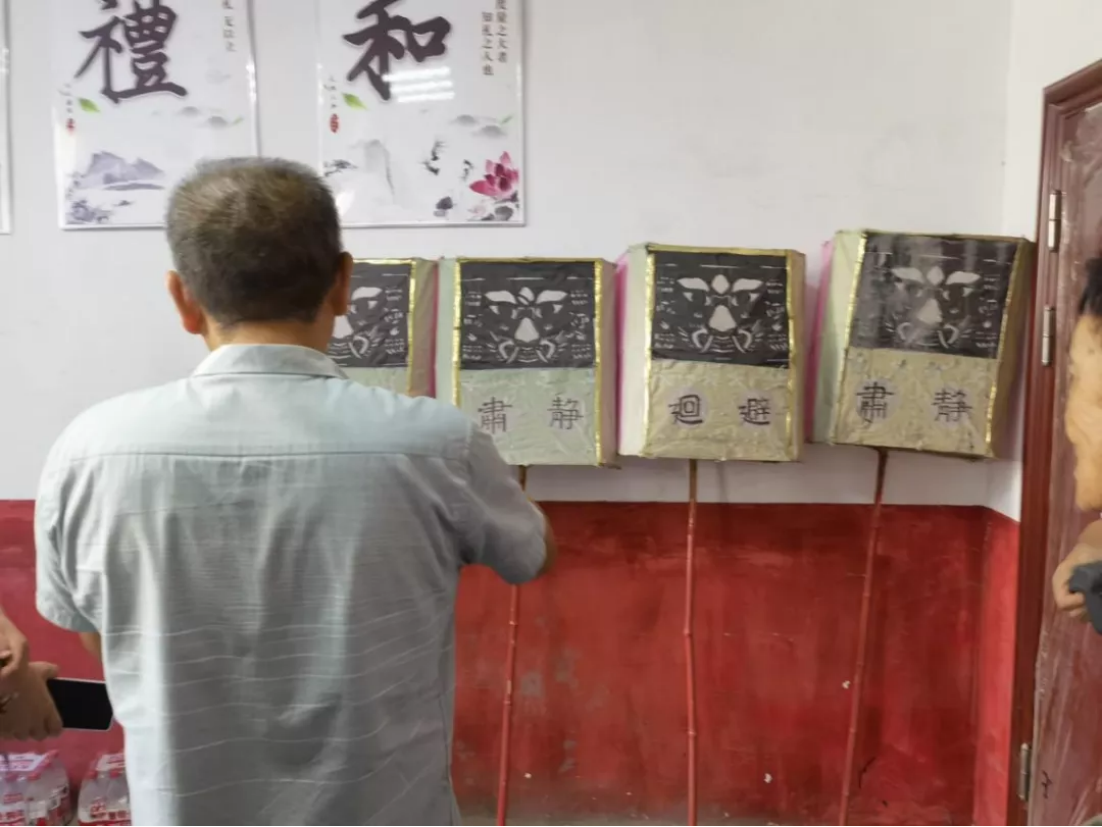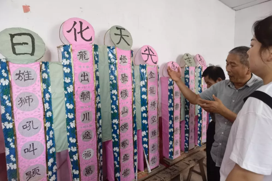 7月22日,调研团队师生再次来到王贵湾祠堂体验感受王贵武龙灯中的龙门龙牌和唢呐锣鼓。龙门和龙牌是王贵舞武龙灯的主要部分,其制作技艺也是需要传承的部分。龙门牌皆为手工制作,四周贴满雕刻的纸花,龙门上的对联每次会根据对新一年的祈福祝愿书写更换。