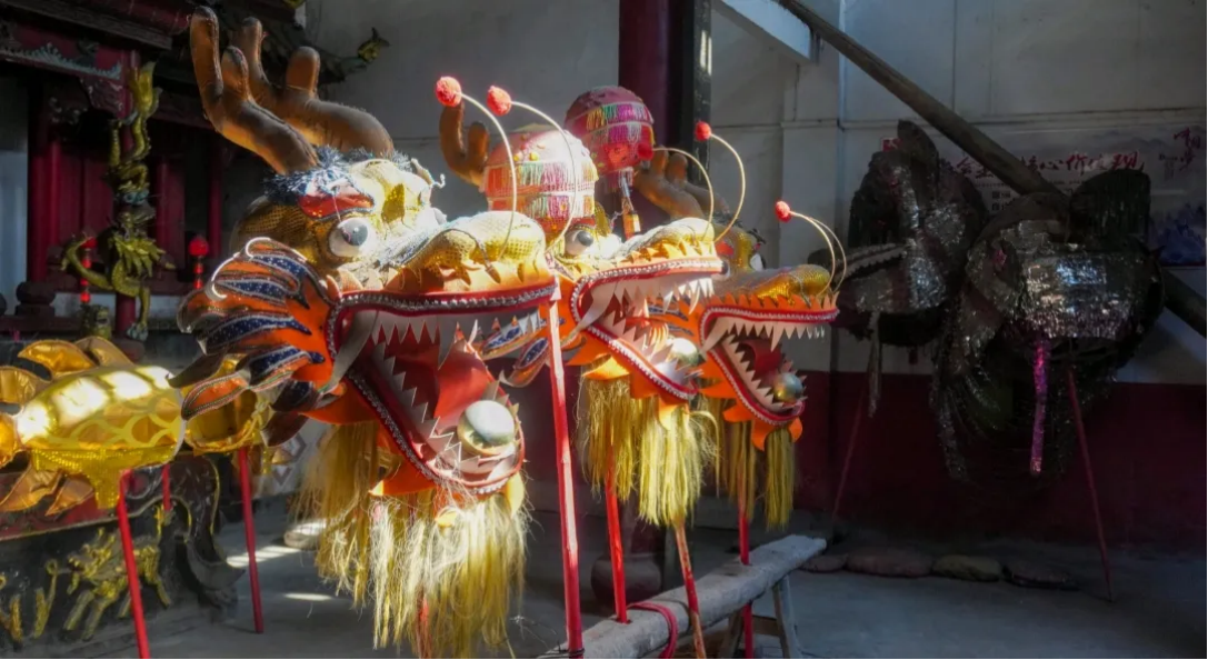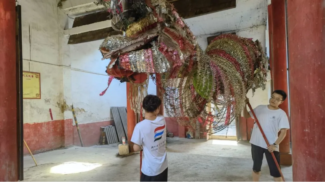 当天下午,在王贤军书记的带领下,调研团队师生去到王贵湾祠堂,近距离感受王贵武龙灯的震撼磅礴。王书记介绍以前每次武龙灯之前都会在祠堂进行“请龙神”仪式,武龙灯结束后便将那纸质的龙灯烧毁,意在把龙神送回去。到了现在为环保及用火安全等原因,王贵武龙灯制作了布艺的龙头龙尾,摆置在祠堂中便于多次使用。