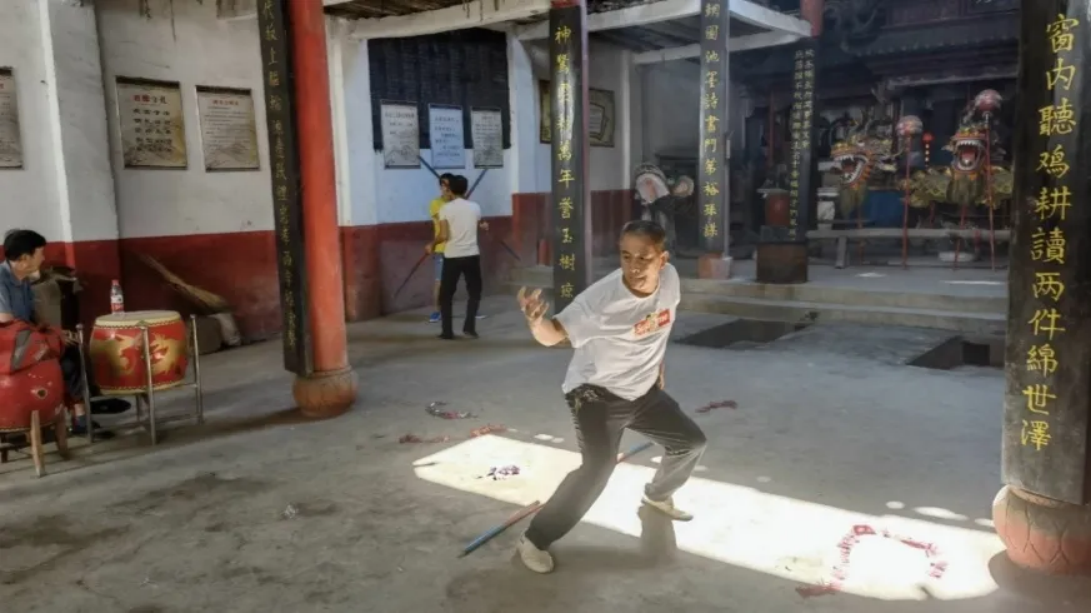 在祠堂中王义财、王贤敏两位80多岁的老师傅给同学们做一段精彩舞天狮子表演,在一旁观看的两位男同学忍不住上前请教,也领略到这独特的非遗魅力,感受到将非遗项目所传承下去是一项伟大的事情。