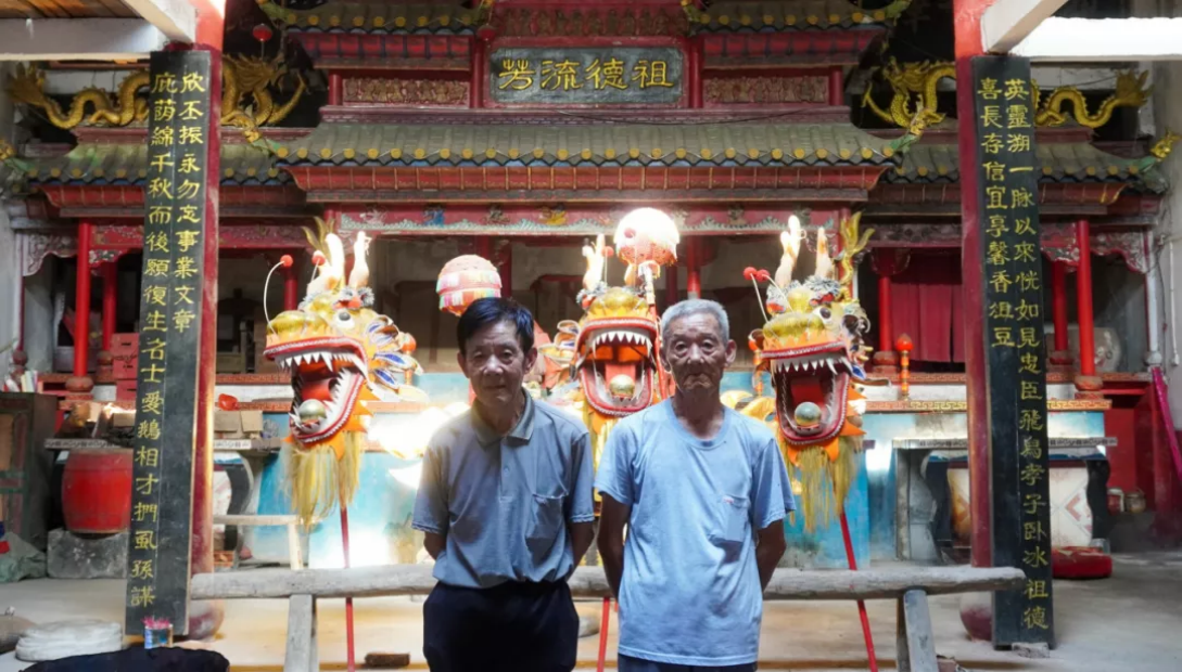(图一、二、三分别为:两位老师傅合影、在王贵湾祠堂舞大狮子、王贵武龙灯的“武”)
