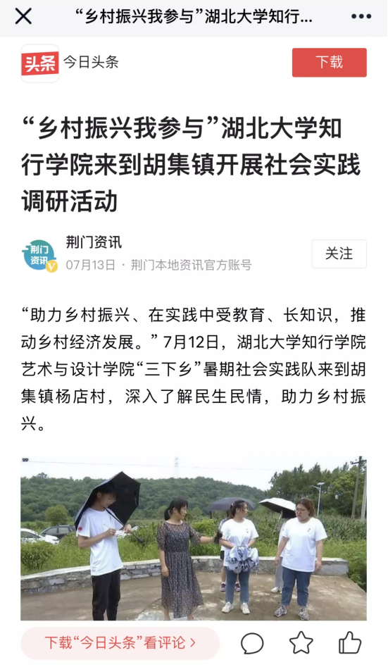 此次艺术与设计学院学生党支部暑期三下乡实践活动受到广大媒体关注先后被学习强国、湖北身边事、头条新闻、荆门日报、荆门晚报、钟祥电视台、云上钟祥等媒体报道。