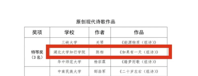 经自主申报、校团委推荐和专家评审,我校会计学院学子陈相以原创作品《如果有一天》(组诗)荣获原创现代诗歌类特等奖(全省仅三名)。人文学院学子陈林林以原创作品《半成品》(组诗)荣获原创现代诗歌类一等奖(全省仅六名),并以原创散文《日常小记》荣获原创散文作品类二等奖(全省仅八名)。人文学院学子张灵洁原创散文《我在寻路,亦在寻你》荣获原创散文作品类三等奖(全省仅十八名)。
