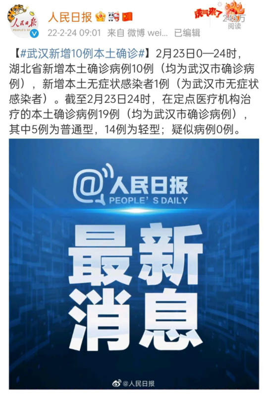 据湖北省卫生健康委员会官网2月24日消息,2月23日0-24时,全省新增本土确诊病例10例(均为武汉市确诊病例),新增本土无症状感染者1例(为武汉市无症状感染者),新增境外输入新冠肺炎确诊病例4例(为巴基斯坦输入),新增境外输入无症状感染者4例(为巴基斯坦输入),新增疑似病例0例,新增死亡病例0例,当日出院病例0例,当日解除无症状感染者医学观察0例。
