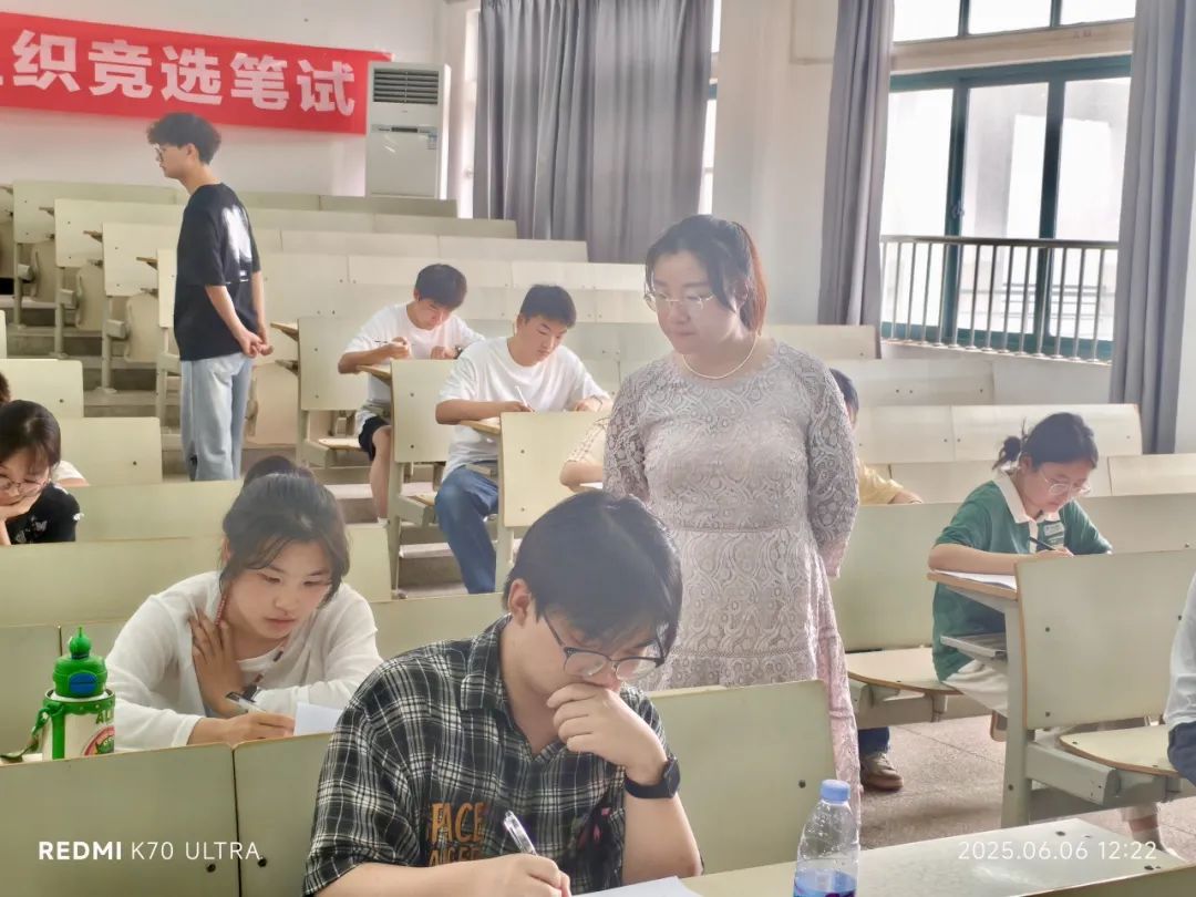 为进一步推动学生骨干的选拔工作,强化学生组织建设,6月6日中午,校团委在知新楼207教室举行2025年校级学生组织主席团干部竞选笔试,共有39名学生干部参加此次笔试。党委委员、副校长刘张虎,校团委书记吴瑛深入考场开展巡考工作。