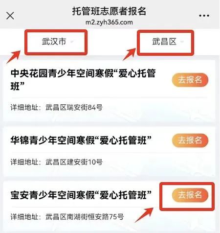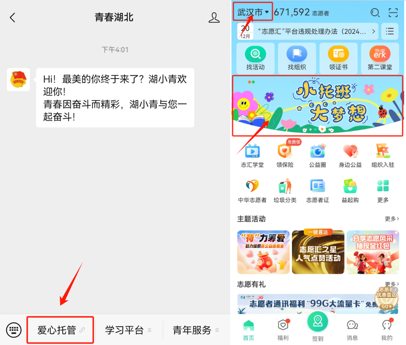 步骤一:点击“青春湖北”微信公众号下方菜单“爱心托管”,或进入“志愿汇APP”选择湖北省内定位,进入湖北省“爱心托管班”志愿者招募管理平台。