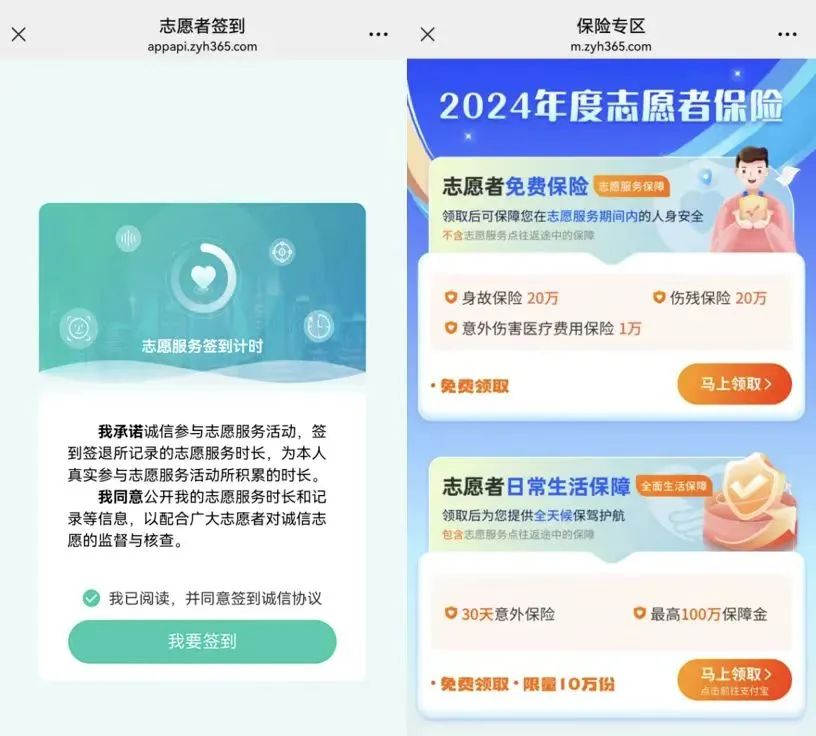 报名成功参与服务的志愿者,可以继续登录该页面,在首页点击“签到”和“领取保险”。