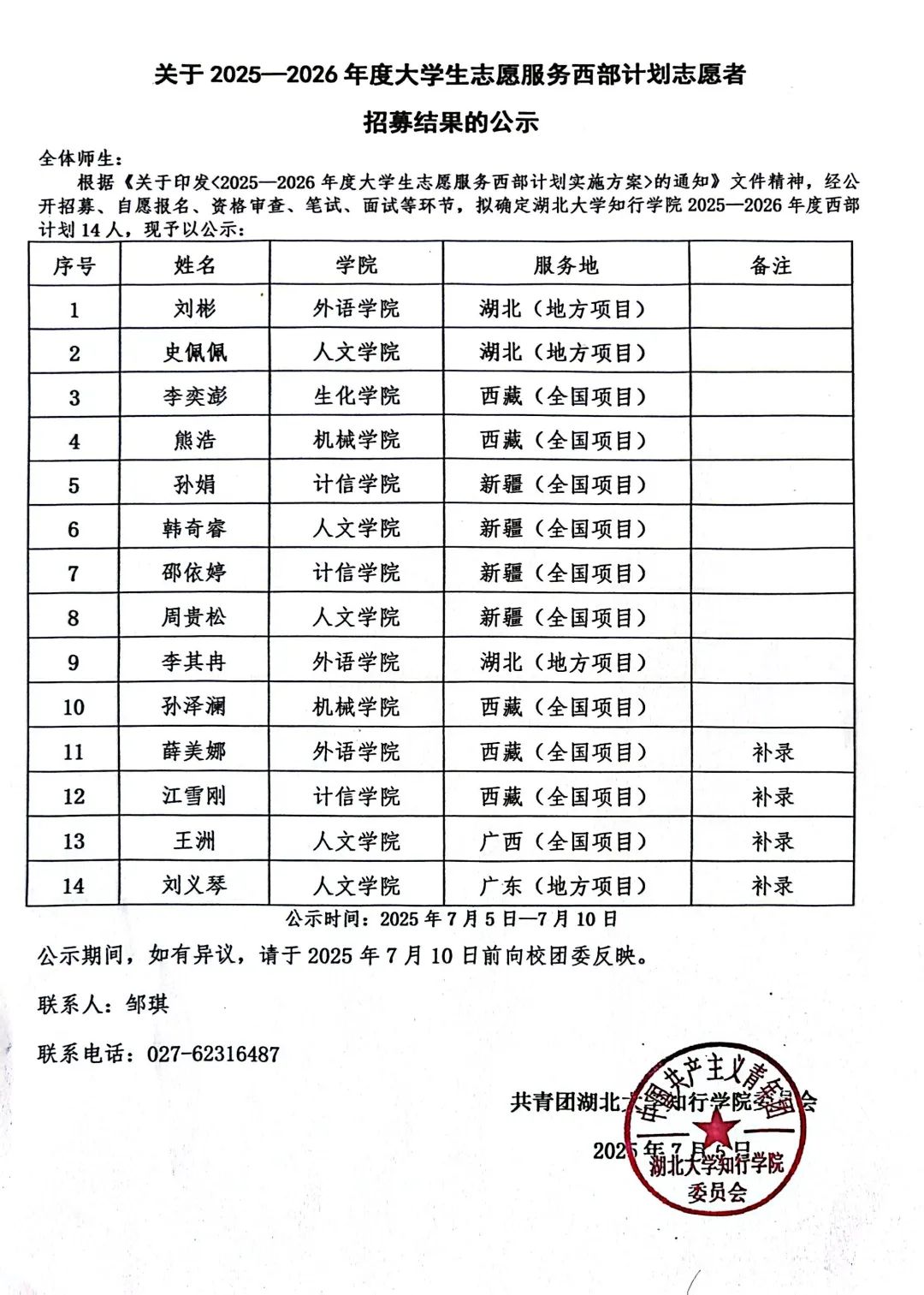 根据《关于印发<2025-2026年度大学生志愿服务西部计划实施方案>的通知》文件精神,经公开招募、自愿报名、资格审查、笔试、面试等环节,拟确定湖北大学知行学院2025-2026年度西部计划志愿者10人,后补录4人,现将拟录取名单予以公示: