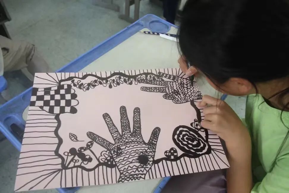 手工绘画课。学生依托自身的想象力以“手掌”和“树林”为主题自由创作。运用色彩和线条表达想法。课程侧重于提供自由创作空间,鼓励学生围绕特定主题完成绘画作品。