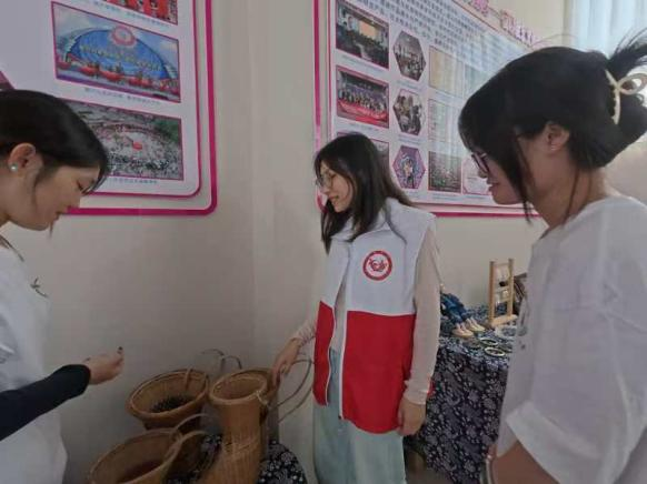 非遗传承调研中,实践团走访团山社区 “蝴蝶妈妈” 苗绣文化坊及苗族文化陈列馆,向非遗传承人及当地负责人请教 “打籽绣”“辫绣” 等技法,记录纹样中的苗族迁徙史与图腾内涵,系统学习苗族文化渊源与艺术特色,为教学创作积累非遗素材。