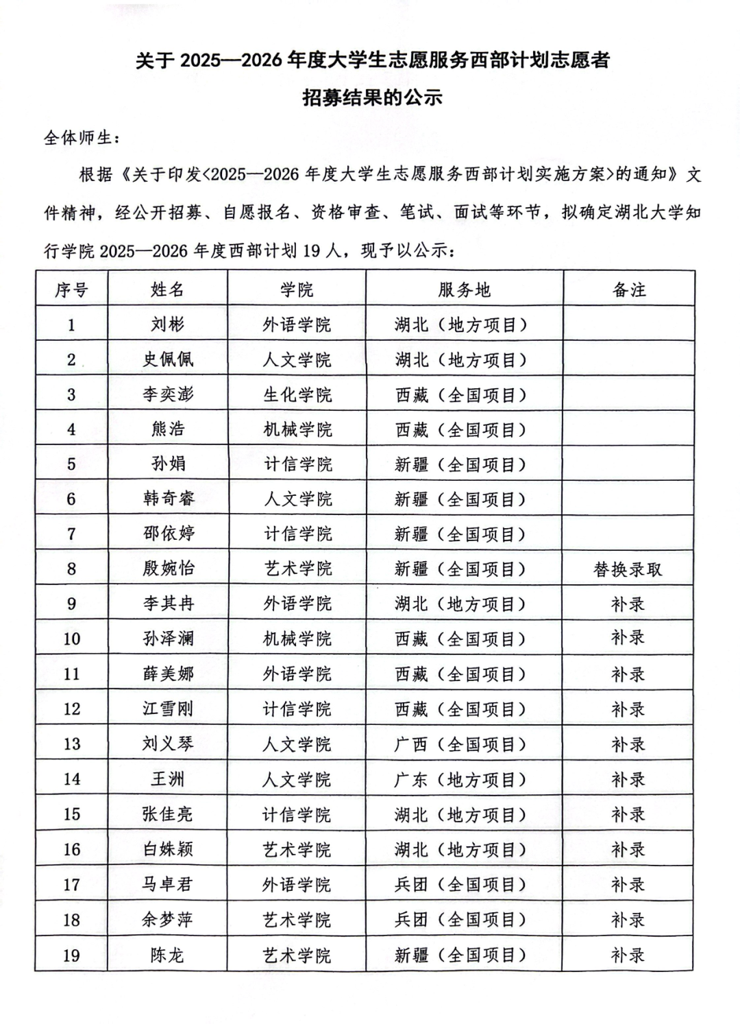 根据《关于印发<2025-2026年度大学生志愿服务西部计划实施方案>的通知》文件精神,经公开招募、自愿报名、资格审查、笔试、面试等环节,拟确定湖北大学知行学院2025-2026年度西部计划志愿者19人,现将拟录取名单予以公示: