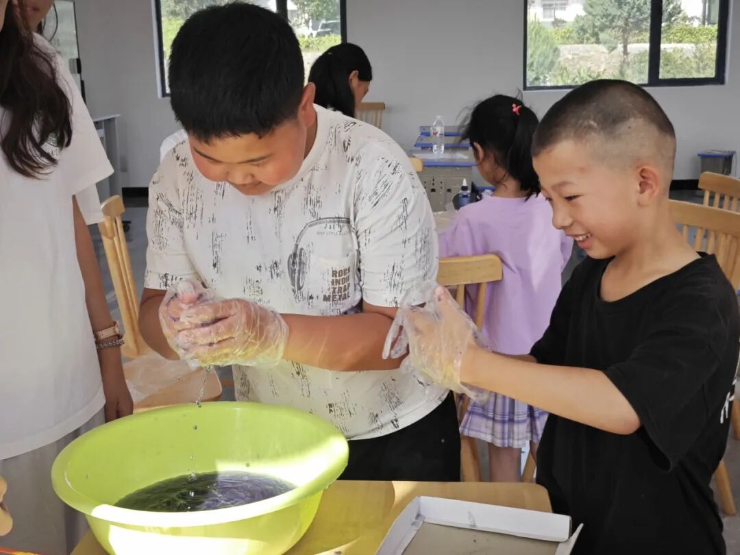 7月3日,队员们除了辅导作业外,还带领孩子们亲手体验了传统扎染技艺。从创意构思、布料捆扎,到浸染和拆解,孩子们在充满惊喜的实践中,切身感受非遗文化的独特魅力。