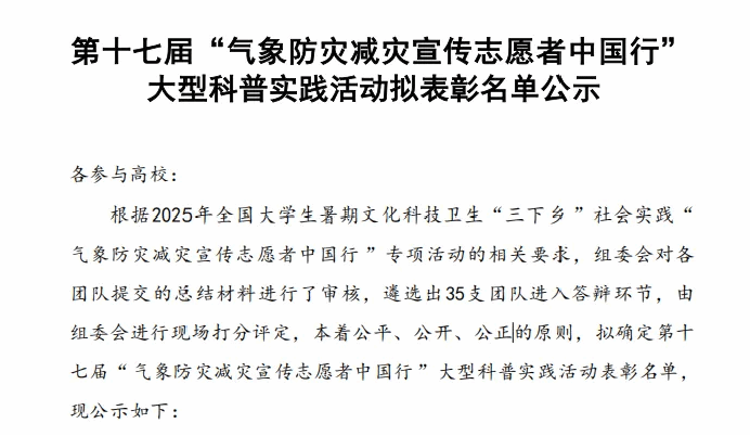 为深入学习贯彻习近平总书记关于气象工作的重要指示精神和关于科学普及的重要论述精神,宣传贯彻新修订的《中华人民共和国科学技术普及法》,落实《全民科学素质行动规划纲要(2021—2035年)》和《气象高质量发展纲要(2022—2035年)》有关部署,引导高等学校青年师生志愿开展气象科普活动,增强公众气象防灾减灾救灾和应对气候变化意识,中国气象局、教育部、共青团中央、中国科协组织高校联合开展第十七届“气象防灾减灾宣传志愿者中国行”活动。