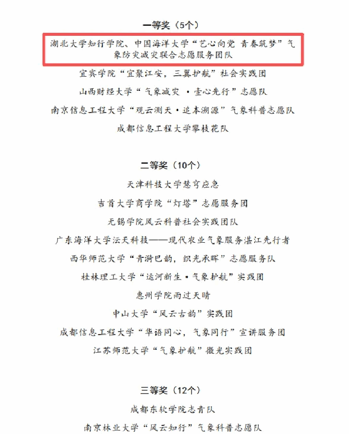 自今年8月“气象防灾减灾宣传志愿者中国行”活动启动以来,我校与中国海洋大学密切合作,艺术与设计学院“艺心向党 青春筑梦”气象防灾减灾联合志愿服务团队荣获国家级一等奖、最佳宣传效果奖。