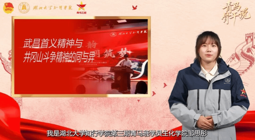 为深入贯彻教育部等七个部门关于面向全国高校开展“立报国强国大志向,做挺膺担当奋斗者”宣传教育通知要求,弘扬伟大抗战精神,深入学习习近平总书记在有关纪念活动上的重要讲话精神。校团委结合“井冈情·中国梦”全国大学生暑期实践专项行动,以“青马骨干说”系列活动为载体,联合开展2025年湖北大学知行学院“中国共产党人精神谱系”宣讲相关活动。