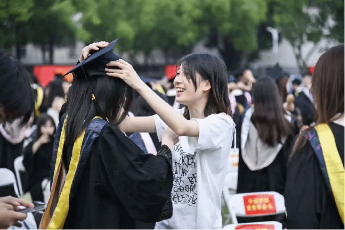 6月15日,毕业典礼暨学位授予仪式上,同学整理学士服。当蝉鸣遇上毕业季,2025届毕业生,下一站星辰大海见!