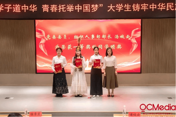 5月15日,第一届“荆楚学子道中华 青春托举中国梦”大学生铸牢中华民族共同体意识演讲比赛决赛,组织人事部部长汤姣云为一等奖获奖选手颁奖。