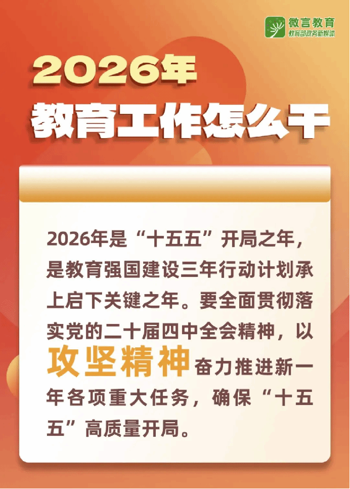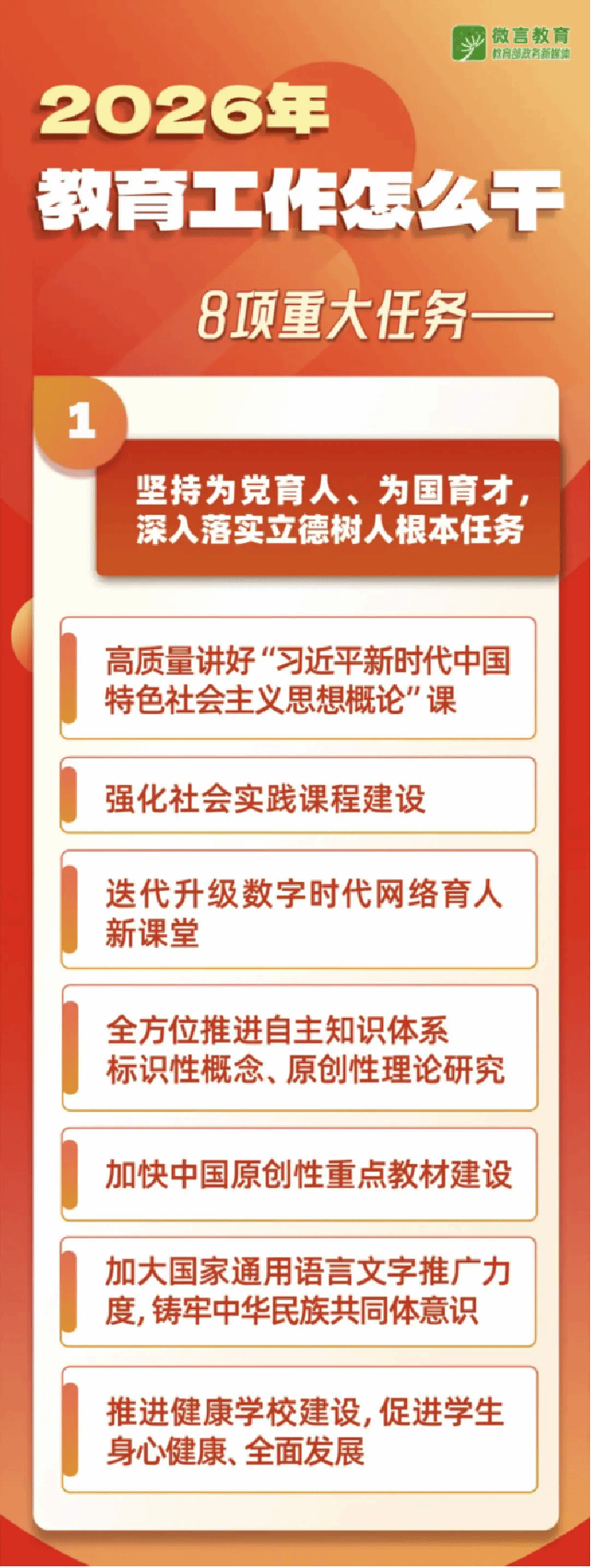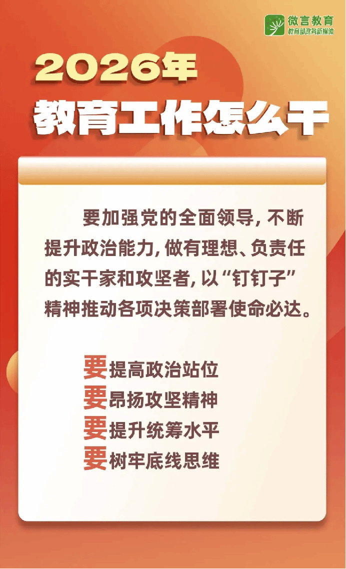 1月8日,2026年全国教育工作会议在北京召开。会议强调了哪些内容?2026年教育工作怎么干?组图为你划重点。
