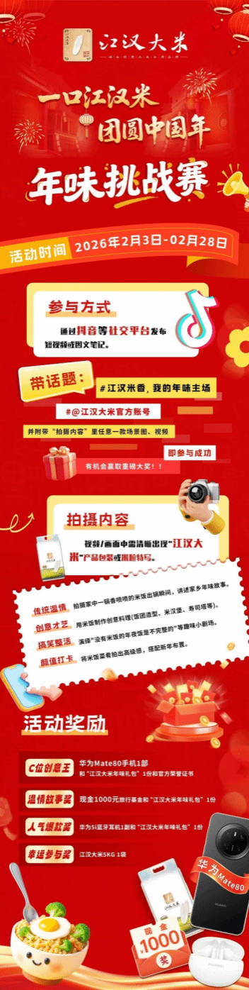 C位创意王:华为Mate80手机一部+“江汉大米年味礼包”一份+官方荣誉证书。