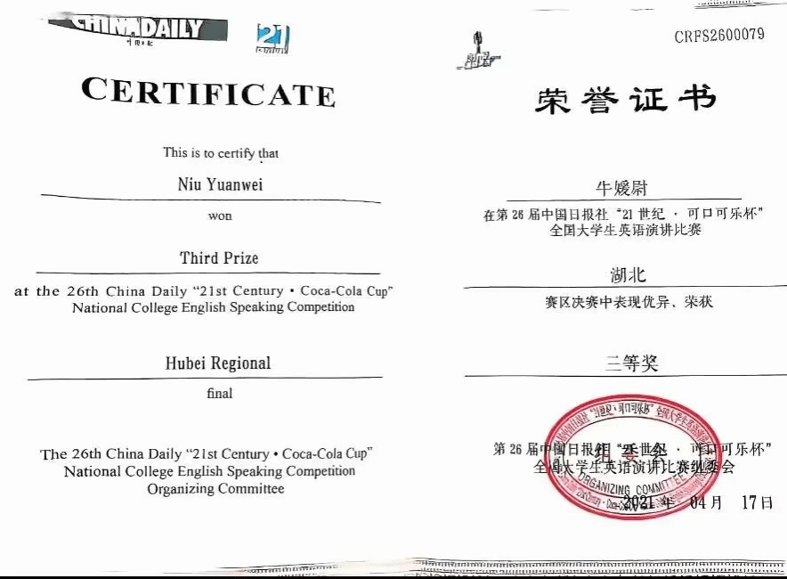 牛媛尉,女,英语2006班学生,多次获评校级奖学金,获得“优秀共青团员”荣誉称号,在湖北省“可口可乐杯”演讲比赛中荣获三等奖,在湖北省第十二届口译大赛中荣获三等奖,在湖北省理解当代中国口译比赛中荣获二等奖,入选成为湖北大学孔子学院国际中文教育志愿者。