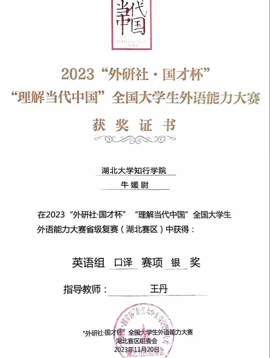 最终牛媛尉在2024年成功入选湖北大学共建海外孔子学院国际中文教育志愿者,并将于7月份前往巴西圣保罗州立大学孔子学院开展国际中文教学。牛媛尉正在通过学习和培训,了解熟悉巴西的风俗与习惯,为赴巴西任教做好充分准备,同时积累她的人生阅历,为弘扬中华传统文化贡献力量。